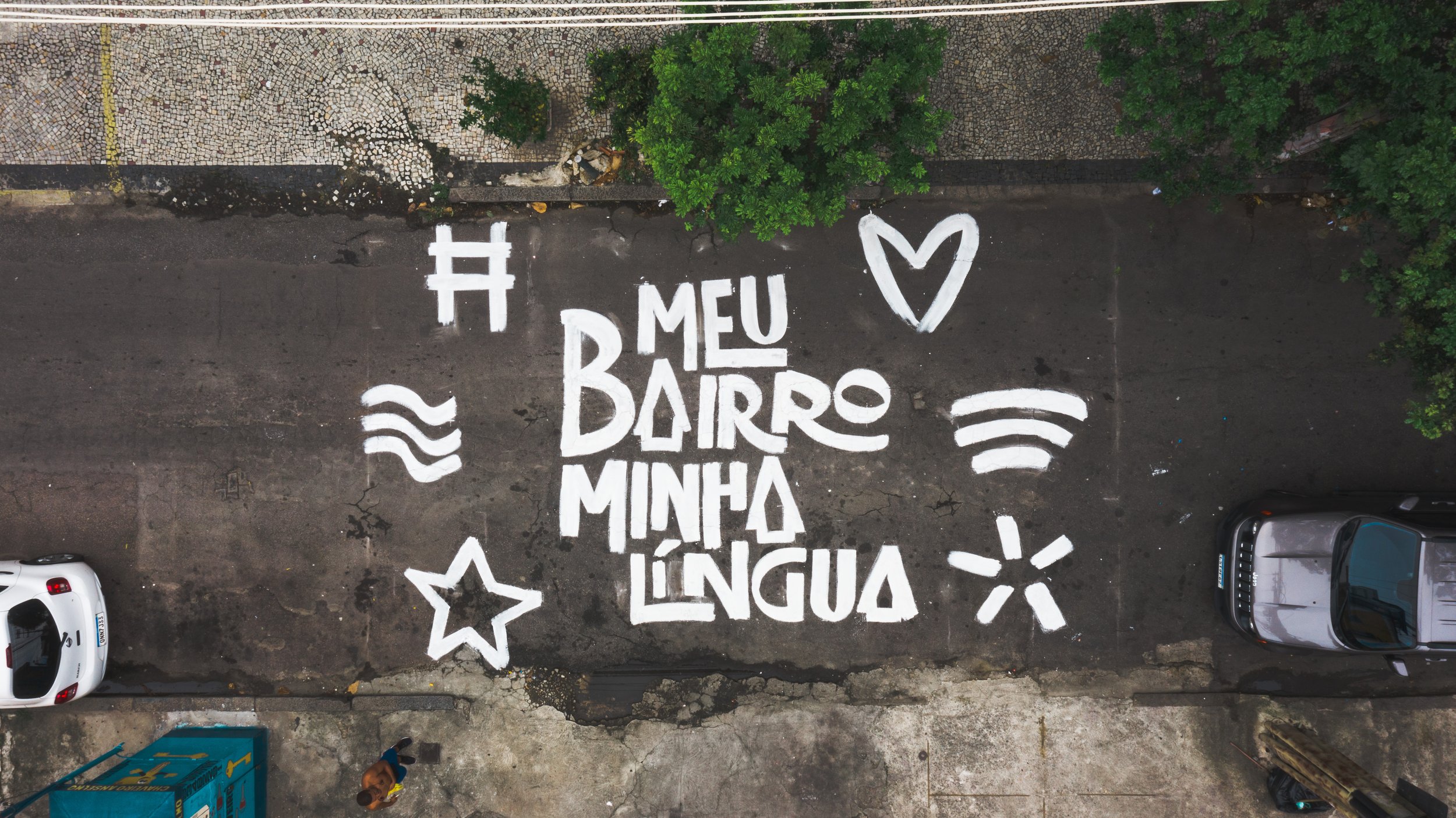 O projeto Meu Bairro e Minha Língua, de Vinícius Terra, celebrava a potência da lusofonia e a reabertura do Museu da Língua Portuguesa, unindo grandes nomes como Elza Soares e Linn da Quebrada. Meu desafio era criar a arte visual do single e da abertura da série, representando o elo entre os territórios. Assumindo a essência do conceito, voltei ao meu bairro de origem, Vila Isabel, e, junto a amigos, transformamos a rua em uma grande tela.